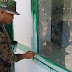 Anggota Satgas TMMD Regtas Ke- 111 Kodim 1202/Singkawang TNI Manunggal Membangun Desa (TMMD) Tampak Serda Wino sedang mengecat Jendela Pustu Desa Sentangau Jaya Jalan Trans Segorong Kecamatan Seluas Kab Bengkayang.